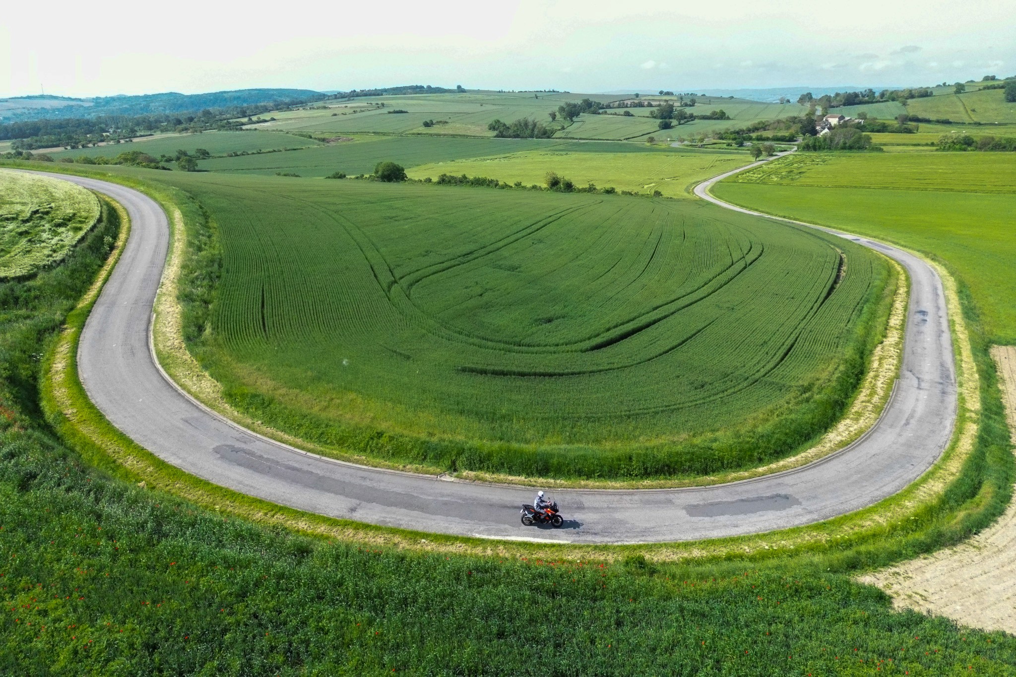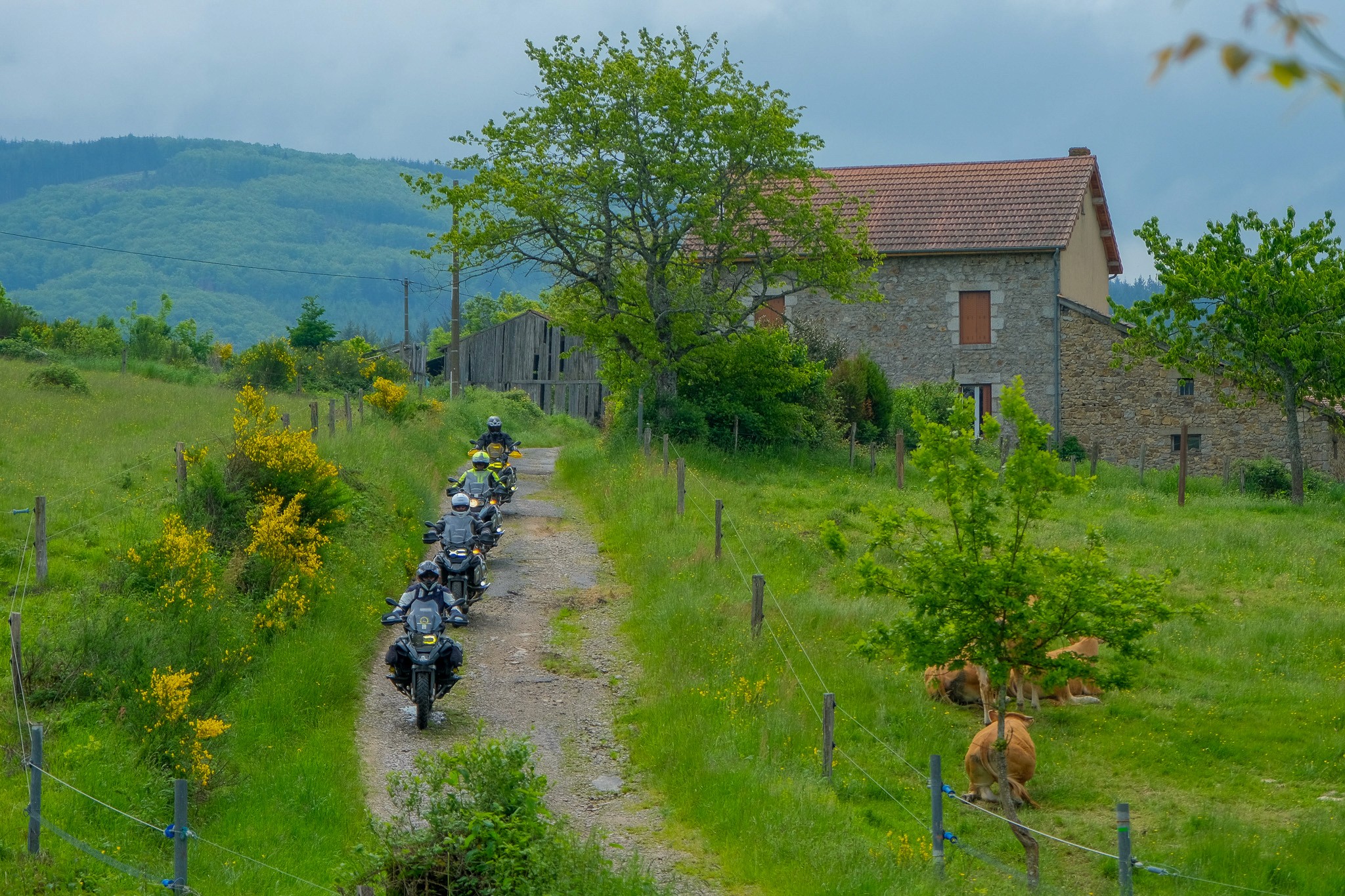 The riding around Domaine Barreaux unfolds gently at first. The land appears flat, but the silhouettes of the Massif Central rise on the horizon. Formed by hundreds of ancient volcanoes, the region offers roads that flow naturally through green pastures and misty highlands. Riding here feels closer to Scotland than central France: mysterious, subdued and endlessly calming. Traffic is scarce, the engines the loudest sound in an otherwise quiet world.