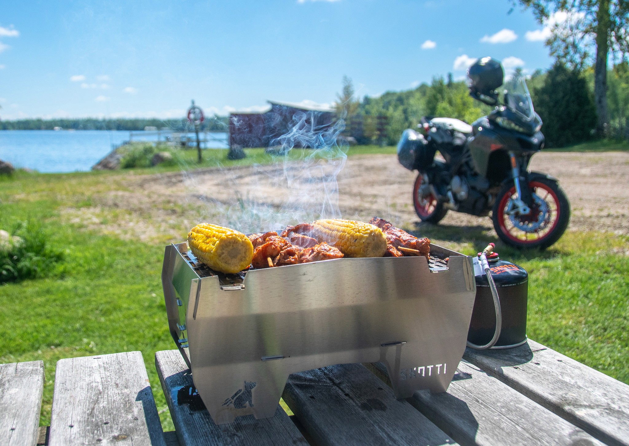 The landscape changes gradually. Open farmland along the southern coast soon gives way to dense forests, winding roads and countless lakes that shape every curve. Traffic thins out until riding becomes almost meditative. Warning signs for moose replace billboards, and the silence is broken only by the engines and the wind through the trees.